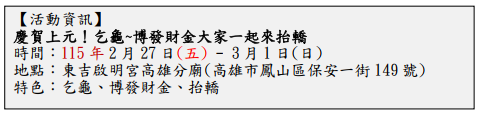 澎湖人俗諺常說「新正玩三天、上元玩三暝」,意指元宵節(上元)的熱鬧程度甚至超過春節,是真正的「小過年」。澎湖南方四島-東吉嶼的信仰中心東吉啟明宮將在高雄分廟舉辦元宵盛會。115年2月27日(週五)至3月1日(週日)期間除了傳統的「乞龜」與「博發財金」,更有震撼人心的「抬轎」,內政部國家公園署海洋國家公園管理處(以下簡稱海管處)邀請大家一同感受「過鹹水」的濃厚鄉情。