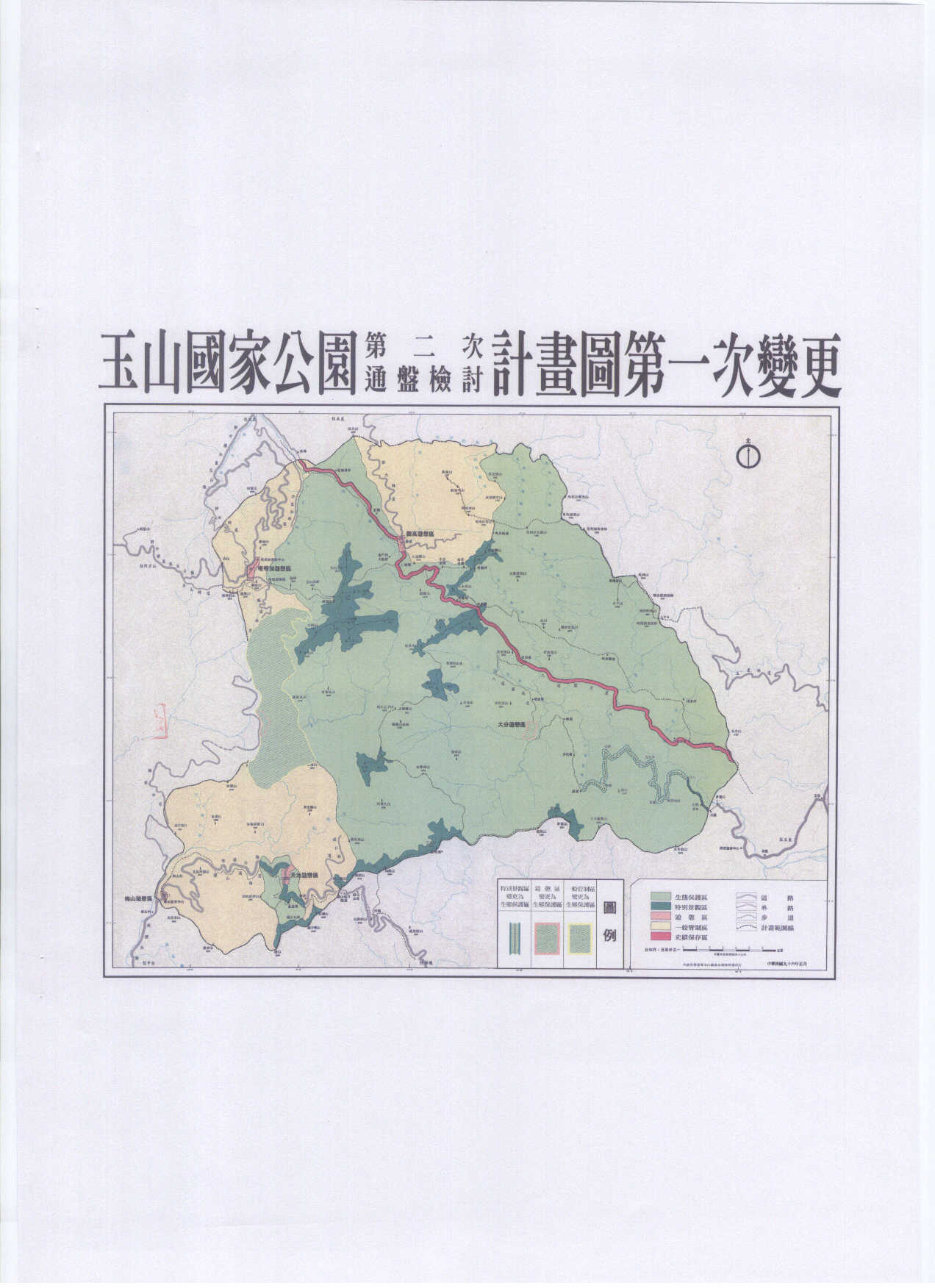 The zoning changes announced in this bulletin covered four main regions: the area along the Nanzihsian River Forest Road (楠梓仙溪林道)changed from a Existing use area to an Ecological Protected Area; the Meilan Recreation Area (梅蘭遊憩區) changed to an Ecological Protected Area; the Walami area(瓦拉米地區) of the Batongguan Traversing Trail (八通關越道) changed from a Scenic Area to an Ecological Protected Area; the Dafeng Recreation Area changed to an Ecological Protected Area. A total of 3,530 hectares were affected by these changes.