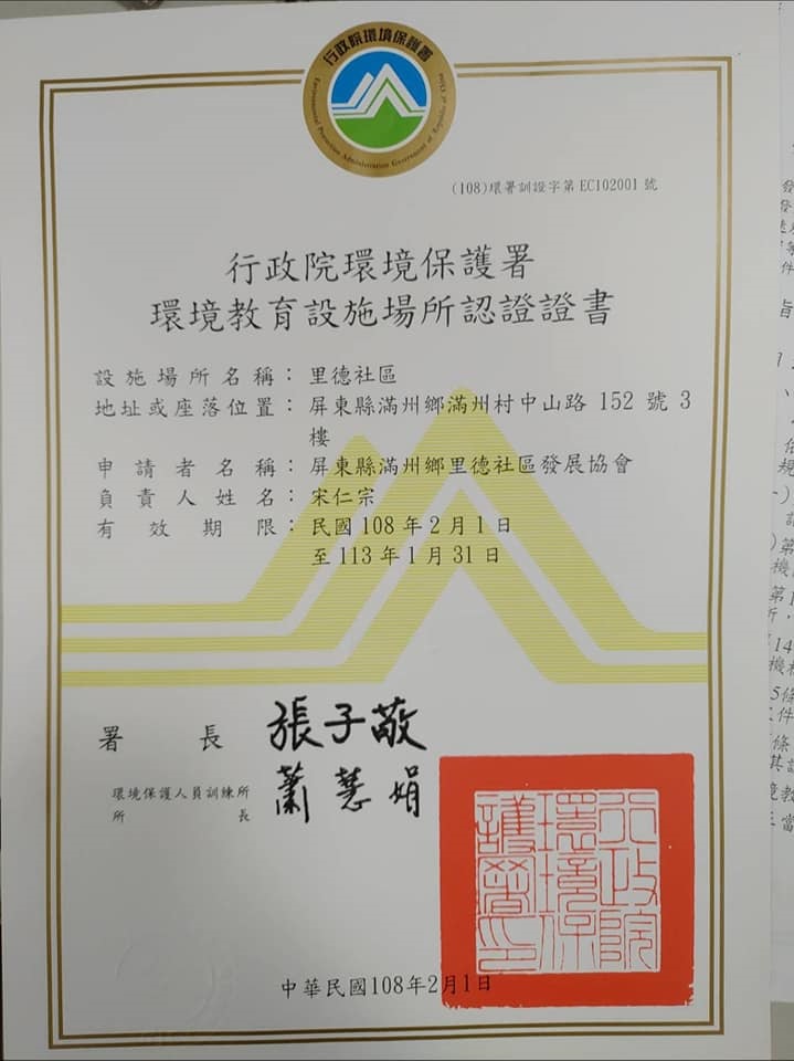 Under the two-year guidance from Kenting National Park Headquarters and National Kaohsiung Normal University from 2017 to 2018, seven people from the Lide community has become certified environmental education teaching staff by 2018. Four education plans - "Lanren River Leisure Tour", "Food & Art", "Ciljasuak Culture", "Grey-faced Buzzard” - were also organized. By the end of 2018, the processes to become a certified facility and place for environmental education under the Environmental Protection Administration were also completed. On February 1, 2019, Lide community area became the first in Pingtung County to be certified as a facility and place for environmental education, with its application submitted by the Community Development Association.