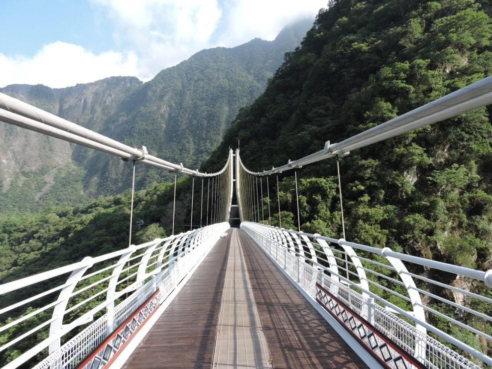 The total length is around 675 meters. The Mountain-Moon Bridge is 196 meters long, 2.5 meters wide, and stretches around 152 meters above the valley. The suspension bridge has the longest span and the largest drop from the valley in the Taroko National Park. The entire route is an accessible walkway that crosses the Liwu Valley from the lower tableland of Buluowan to the opposite side. Superb views can be enjoyed from the bridge overlooking the Liwu Valley; to the west is Taroko Gorge's Swallow Grotto, and to the east, the Buluowan terrace.